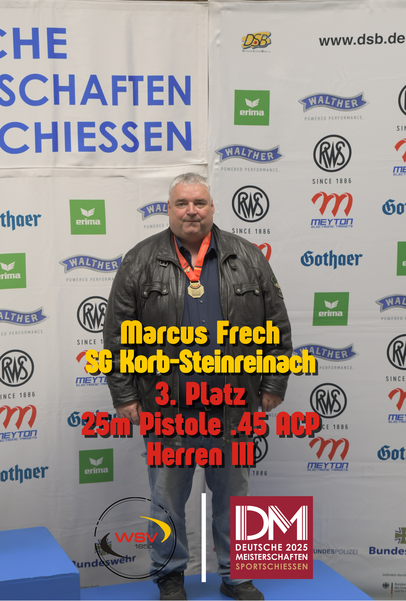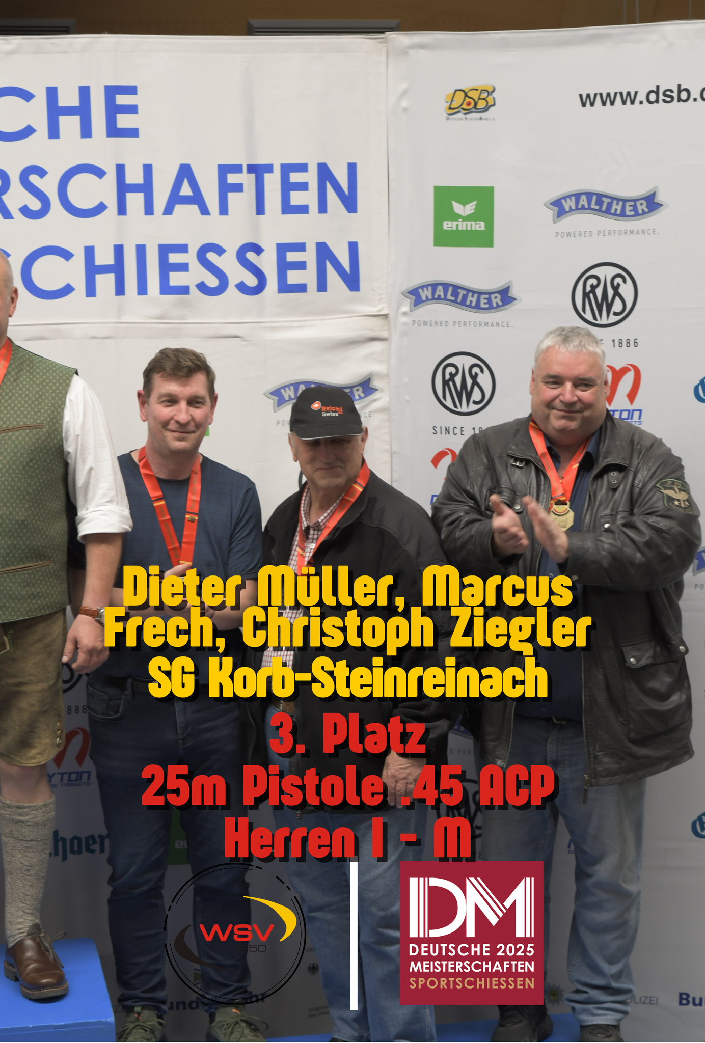 Pistole 45 ACP: Platz 3 für Marcus Frech, Christoph Ziegler auf Pl. 11 und Pl. 22 für Dieter Müller. Die Mannschaft konnte die Bronzemedaille erreichen. Herzlichsten Glückwunsch an alle Korber Schützen für die hervorragenden Leistungen.